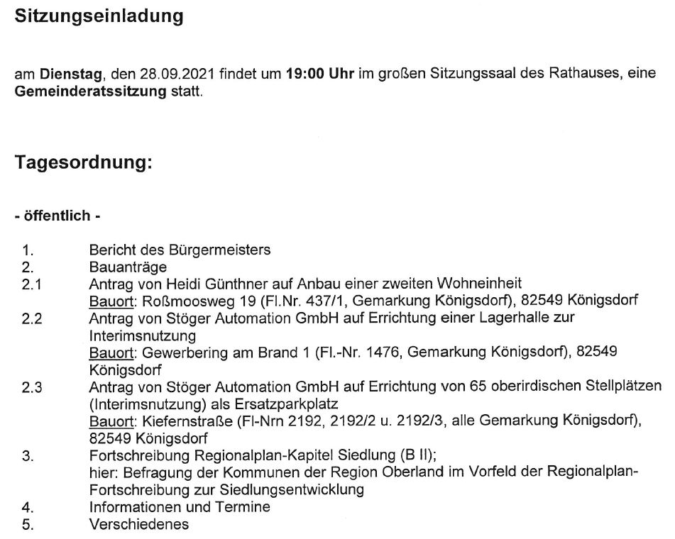 Am Dienstag, den 28.9.21 um 19:00 Uhr, findet die reguläre monatliche Sitzung des Gemeinderates Königsdorf statt. Interessierte Bürgerinnen und Bürger sind natürlich wieder herzlich eingeladen.