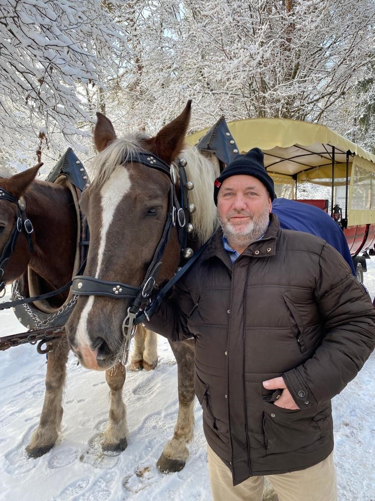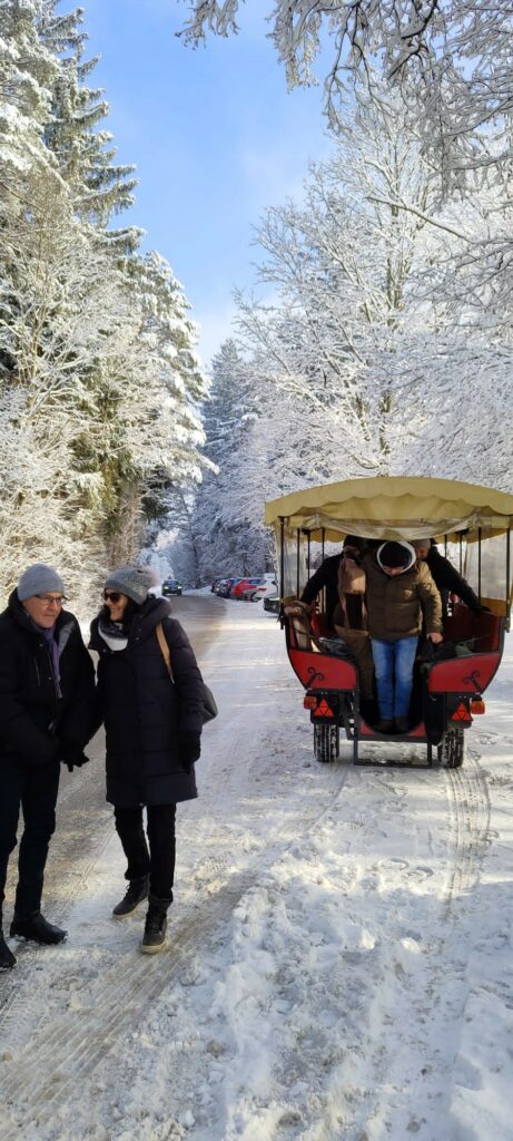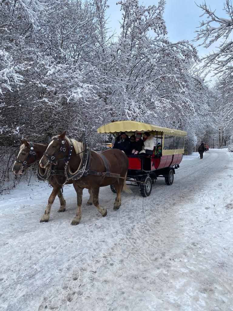 Mit im Gepäck hatten die fünf Burgenländer und eine Burgenländerin etliche lokale Delikatessen, u.a. original Burgenländer Kürbiskernöl, diverse Uhudler-Spirituosen und Knoblauchwurst. Unters Volk gebracht wurden diese Spezialitäten auf dem Wald-Christkindlmarkt der Jugendsiedlung Hochland am 17.12., wo die Unabhängige Bürgerliste (UBL) extra einen Verkaufsstand organisiert und schön dekoriert vorbereitet hatte. Die österreichische Delegation wurde am Vormittag standesgemäß bei strahlendem Sonnenschein in traumhafter Winterlandschaft mit einer Pferdekutsche vom Dorf zum Markt an der Jugendsiedlung transportiert!
