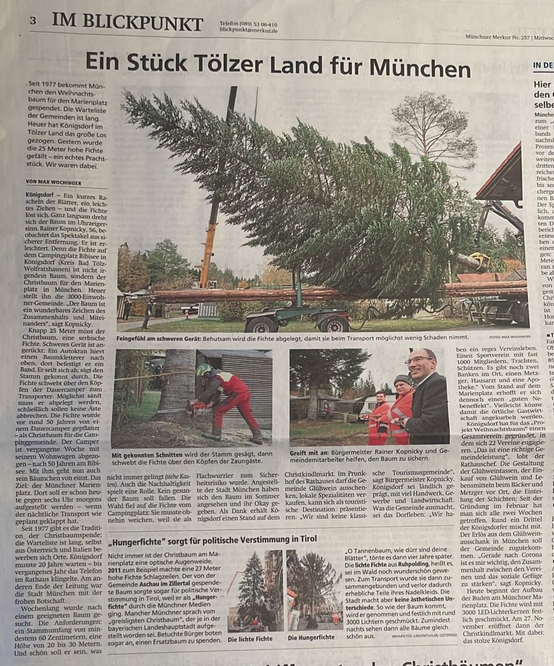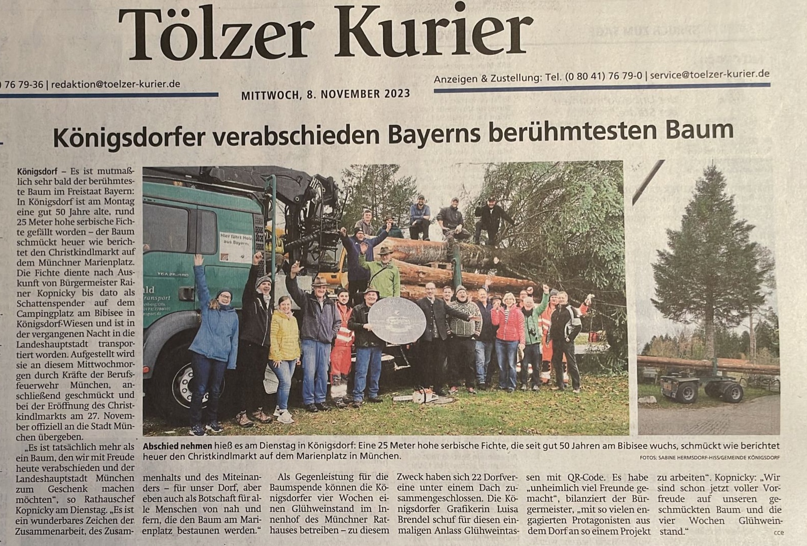 Es ist soweit: Nach über 20 Jahren auf der Warteliste darf die Gemeinde Königsdorf in diesem Jahr den Christbaum für den Münchner Christkindlmarkt am Marienplatz stellen.