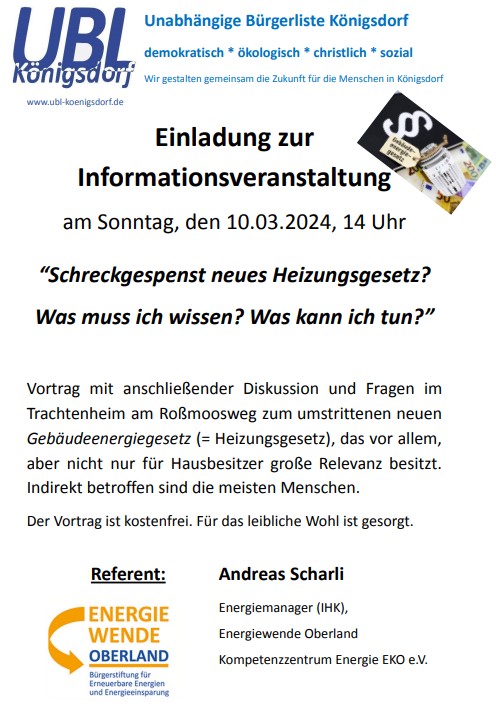 Das sollte eigentlich niemand verpassen! Am Sonntag, den 10.03.2024 veranstaltet die UBL um 14 Uhr im Trachtenheim eine hochrelevante Informationsveranstaltung zu einem Thema, das eigentlich fast alle direkt oder indirekt betrifft. In erster Linie natürlich Besitzer von Wohneigentum: