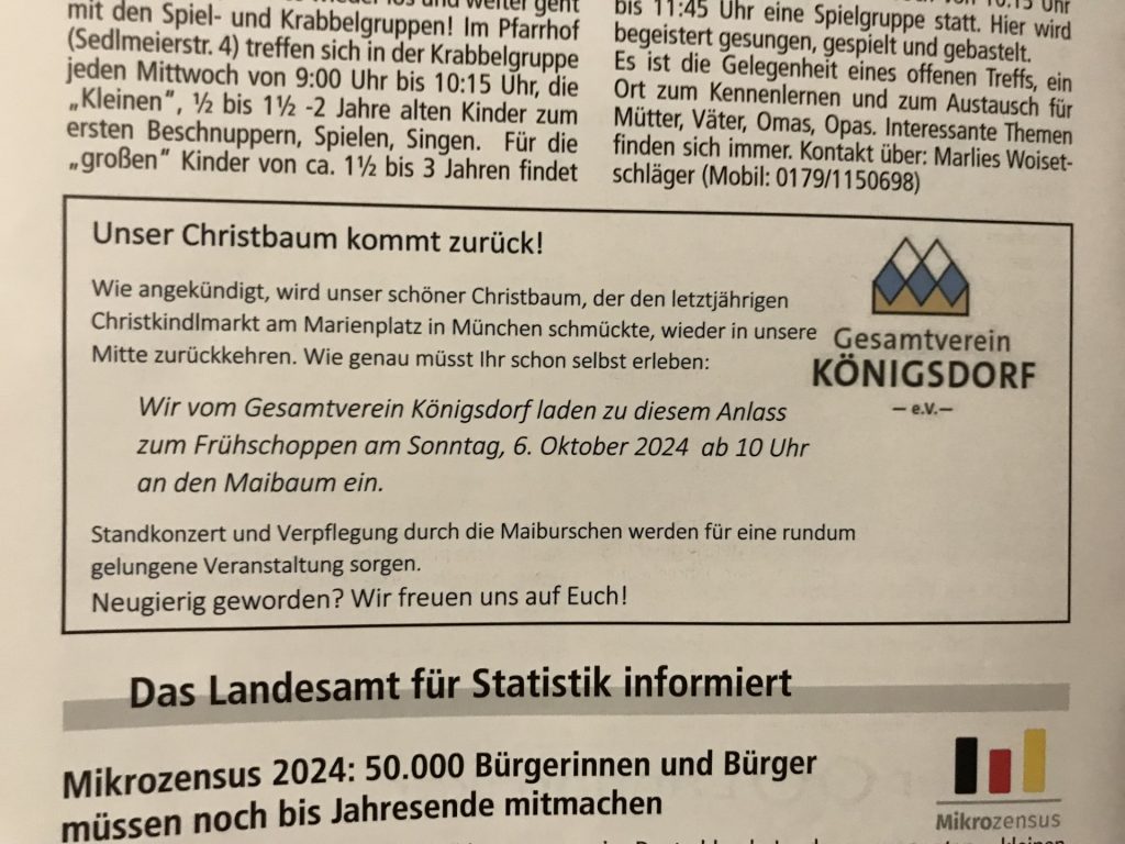 Am Sonntag, den 6.10.24 findet ein vom Gesamtverein Königsdorf veranstalteter Frühschoppen zu Ehren der Rückkehr unseres Christbaums vom Marienplatz statt: