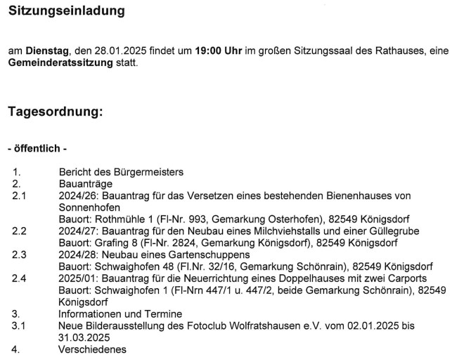 Am Dienstag, den 28.01.2025, findet um 19 Uhr die nächste Gemeinderatssitzung im Rathaus Königsdorf statt. Auf der Tagesordnung stehen diesmal vor allem etliche Bauvorhaben im Gemeindegebiet.