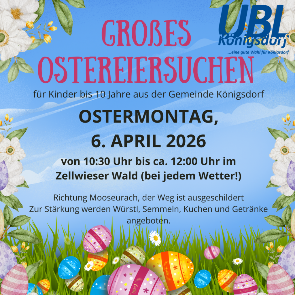 Zu unserem traditionellen und legendären UBL-Ostereiersuchen am Ostermontag im Zellwieser Wald laden wir wieder ganz herzlich alle kleinen Königsdorferinnen und Königsdorfer samt Mama, Papa, Oma, Opa etc. ein… Das wird wieder ein großer Spaß für alle Beteiligten!